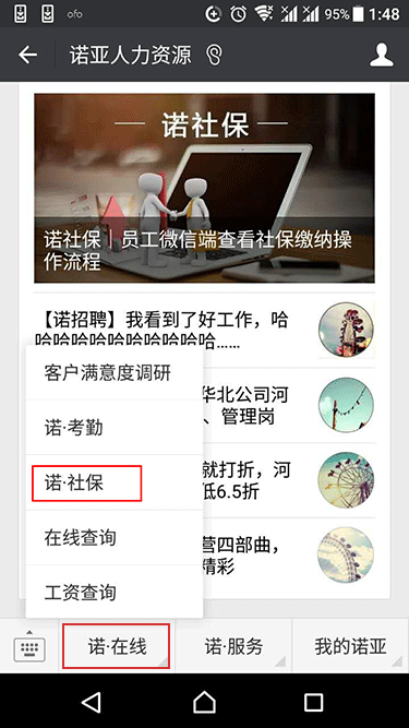 1、关注微信号:“诺亚人力资源”或“NOAH-HR”,点击“诺在线”,选择“诺社保”。