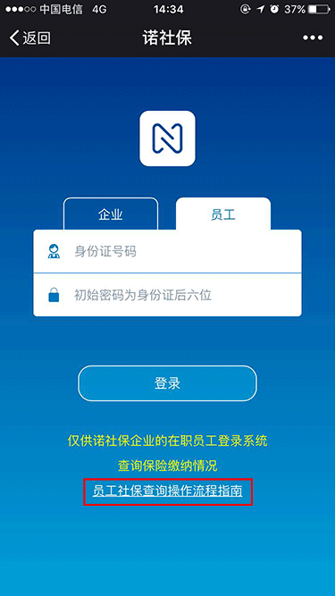2、在企业和个人员工登录框界面,点击员工,输入员工身份证号及初始密码(身份证后六位,登录后自行修改密码)。可以点击底部链接“员工社保查询操作流程指南”,查看员工操作流程。