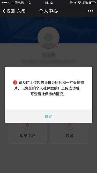 3、登录个人中心后,提示上传个人身份证照片,点击“确定”进入个人信息编辑页。(上传身份证为了您的个人信息正确,确保社保局缴纳保险核对信息无误)