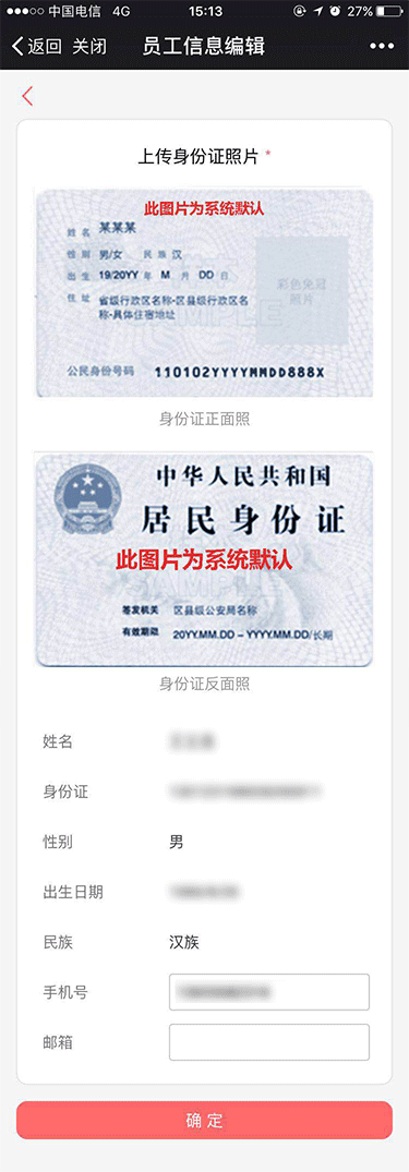 4、员工信息编辑页可以点击默认图片替换身份证照片,还可以修改手机号,邮箱。